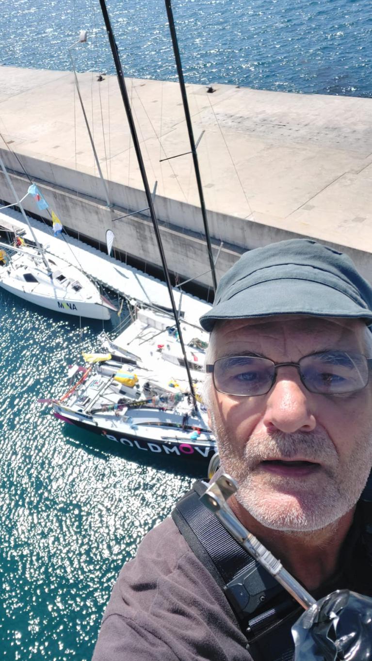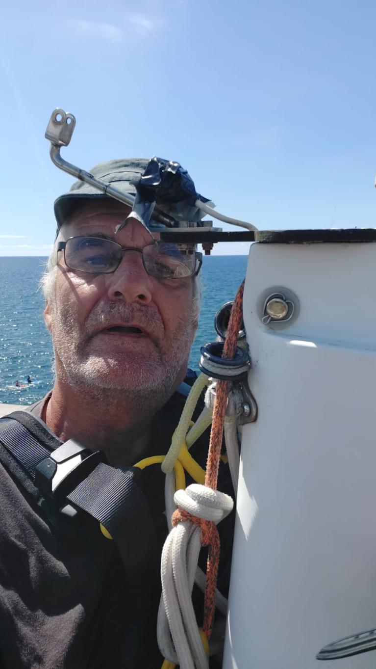Petit tour en tête de mât, après l'arrivée, pour enlever l'aérien (fragile) pendant l'entre-deux manches