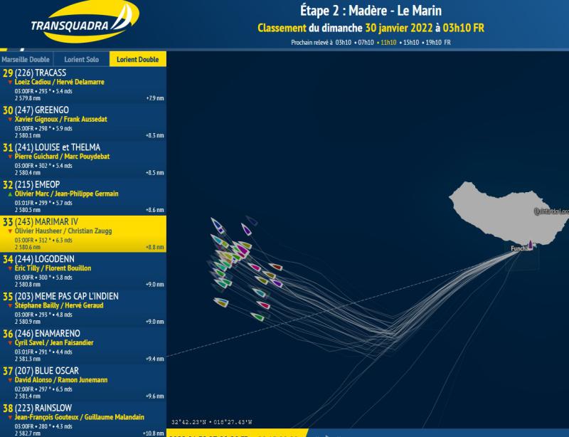 Nous observons LOGODENN (nom Transquadra inconnu) qui est le premier de notre petit groupe encore en contact AIS à empanner. Ce sera intéressant de suivre sa progression. Notre routage nous incite cependant à continuer tribord amure encore vers le NO (NW pour les anglo-saxons)