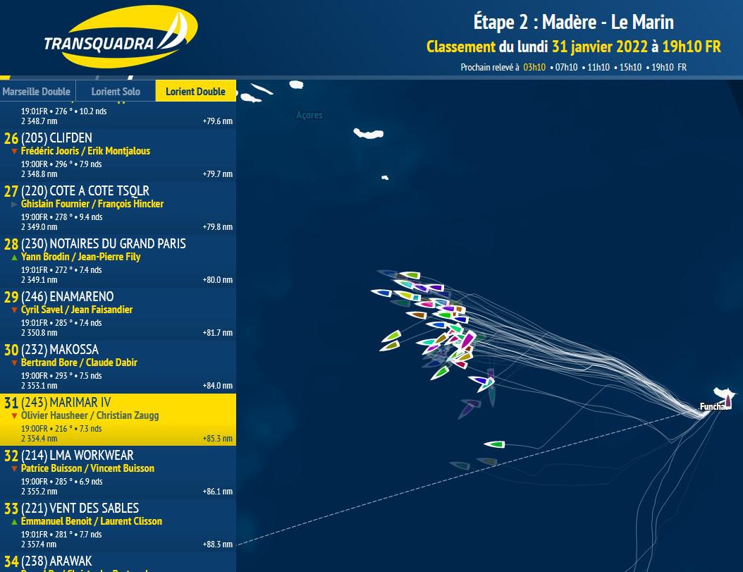 Vers 6h GMT, nous retrouvons la latitude du port de Madère. Les conditions restent assez soutenues, avec une mer plutôt désordonnée, mais on prévoit une route plus confortable par la suite.