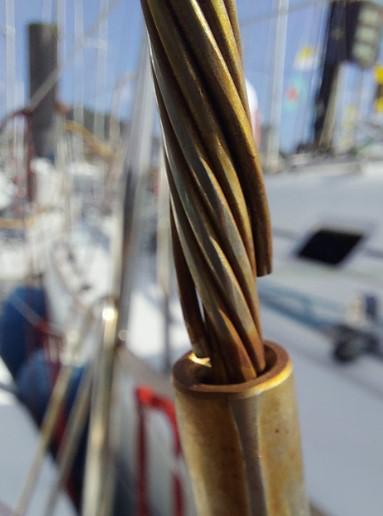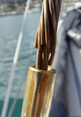 L'espérance de vie de ces câbles inox en mer est de 10 ans. Ceux de Marimar en ont 5 ???🤔😬🥴😡. Il faut que ça tienne encore 130 Milles. Le câble a été soulagé par 3 drisses passées par dessus la barre de flèche opposée et capelée sur la cadène de bas hauban 👍👏 le problème de l'inox c'est qu'on ne voit pas quand ça vieilli et tout d'un coup ça lâche !